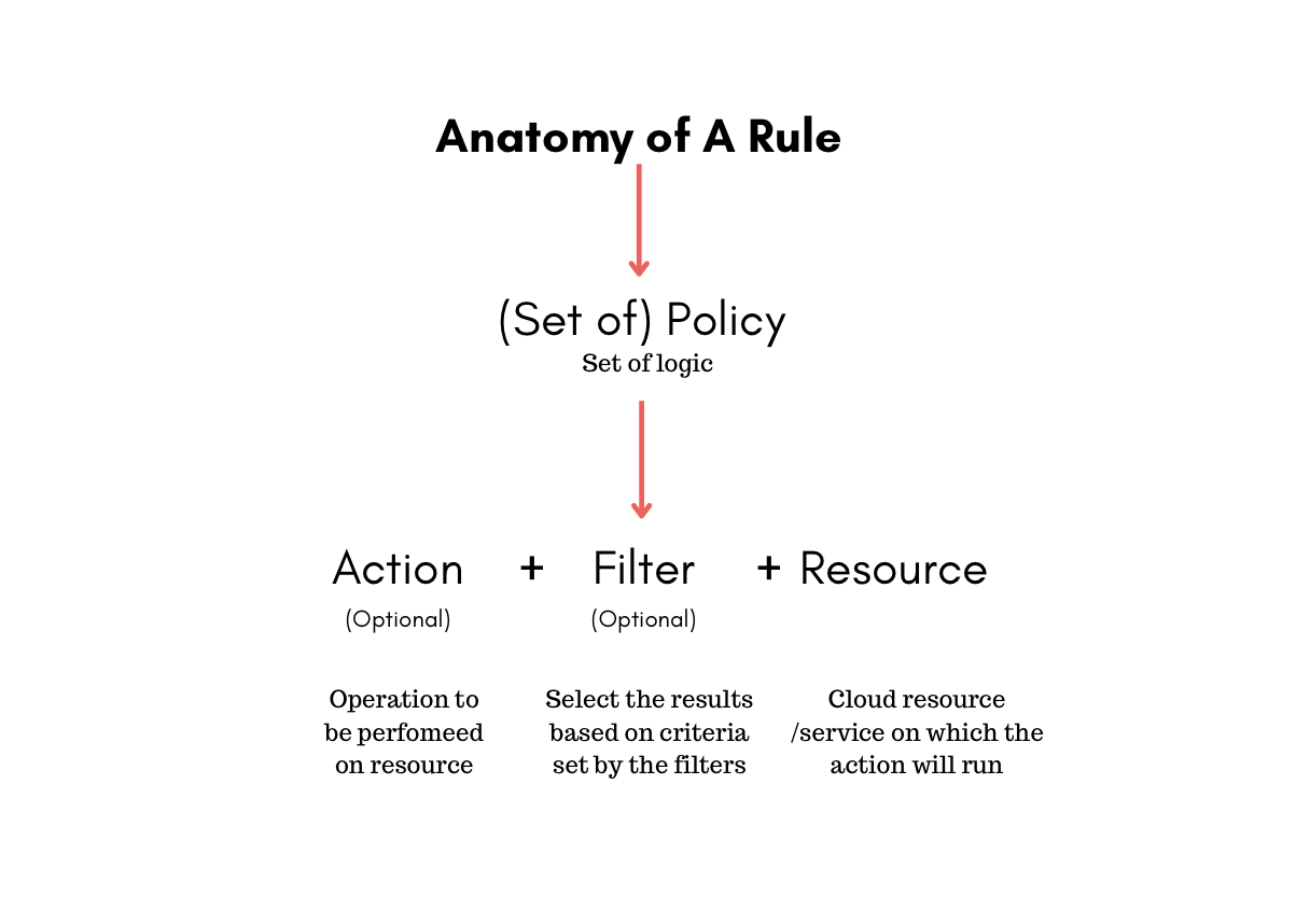 So essentially, a Rule is a file that includes logic defined by a policy that performs certain actions on the resource based on the filters provided by the user. Rules can include multiple policies, and policies include resource, filters and actions.