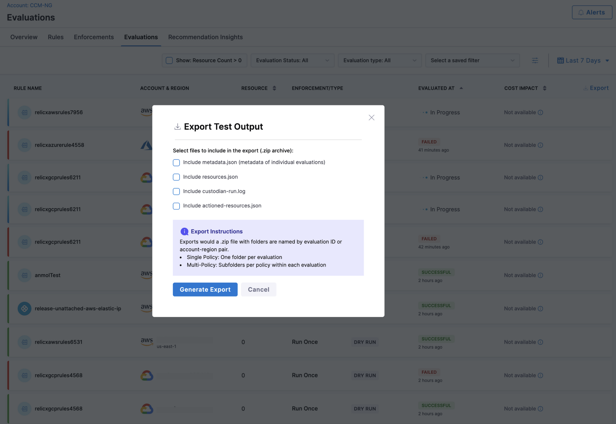 Use Bulk Export to download up to 100 evaluation results (AWS, GCP, or Azure) in a single ZIP file. Export is available when all selected evaluations are in a terminal state (Succeeded or Failed).