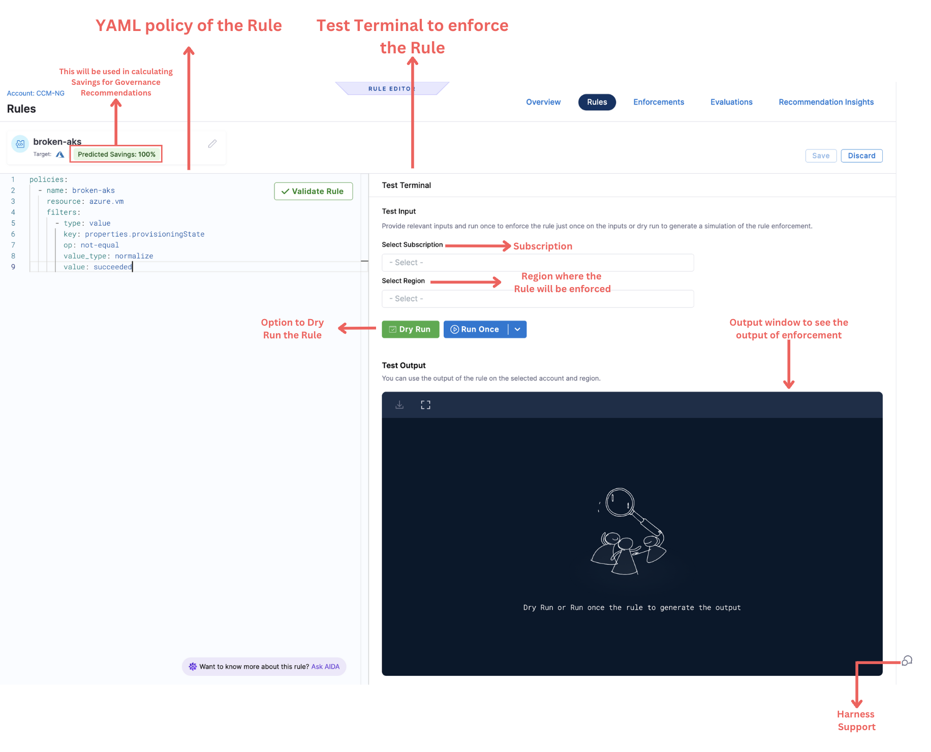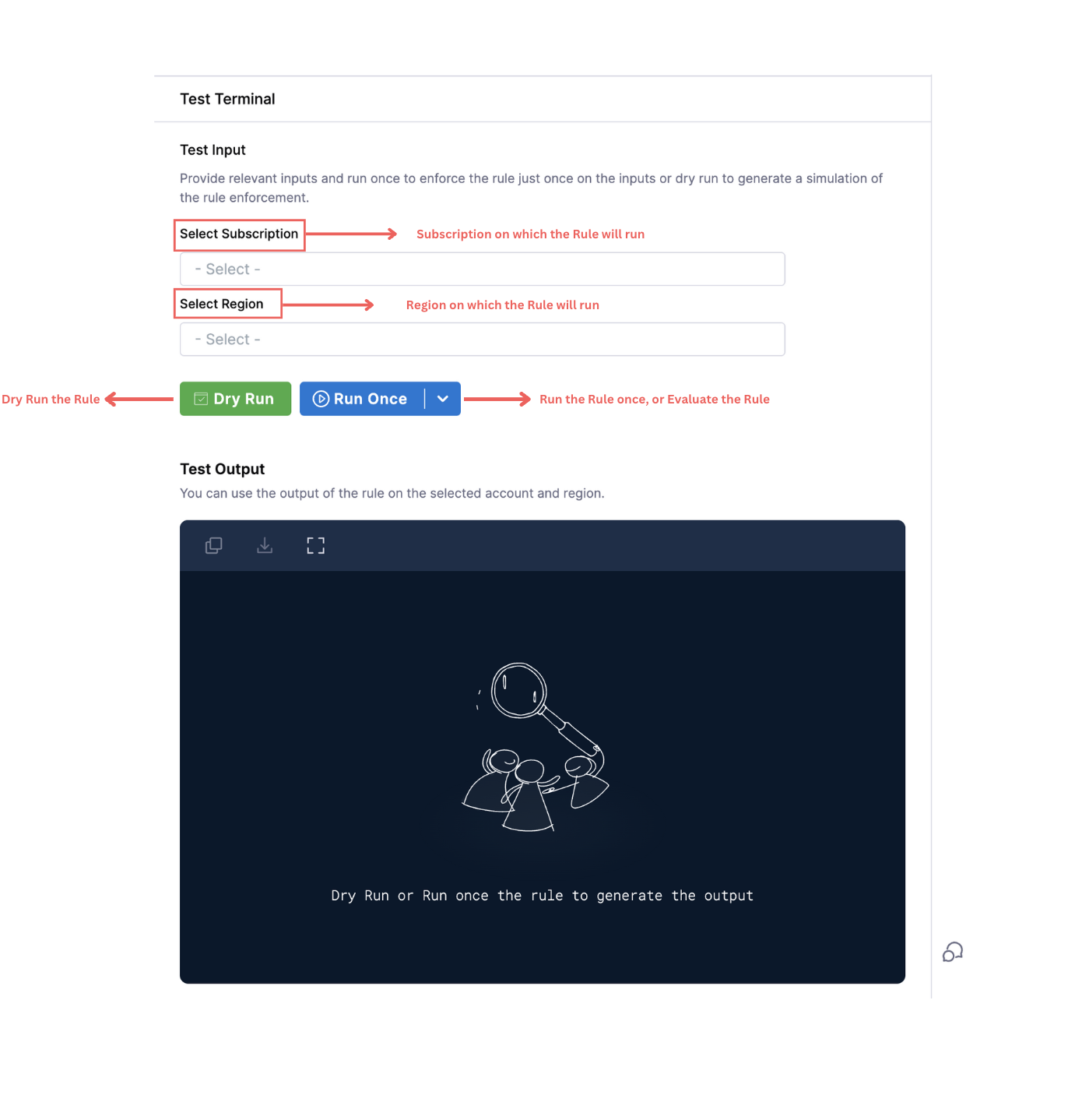 In the rule editor, a test terminal is present for users to see the output in the terminal itself upon evaluating a Rule. This is done to ensure that users can run the rules and try accordingly to check how the output would look on the selected subscription and region. There are two options: first, to select the target subscription and second, to select the regions. After providing the relevant inputs, the users can select either to dry run the rule first, run it once or enforce the rule.