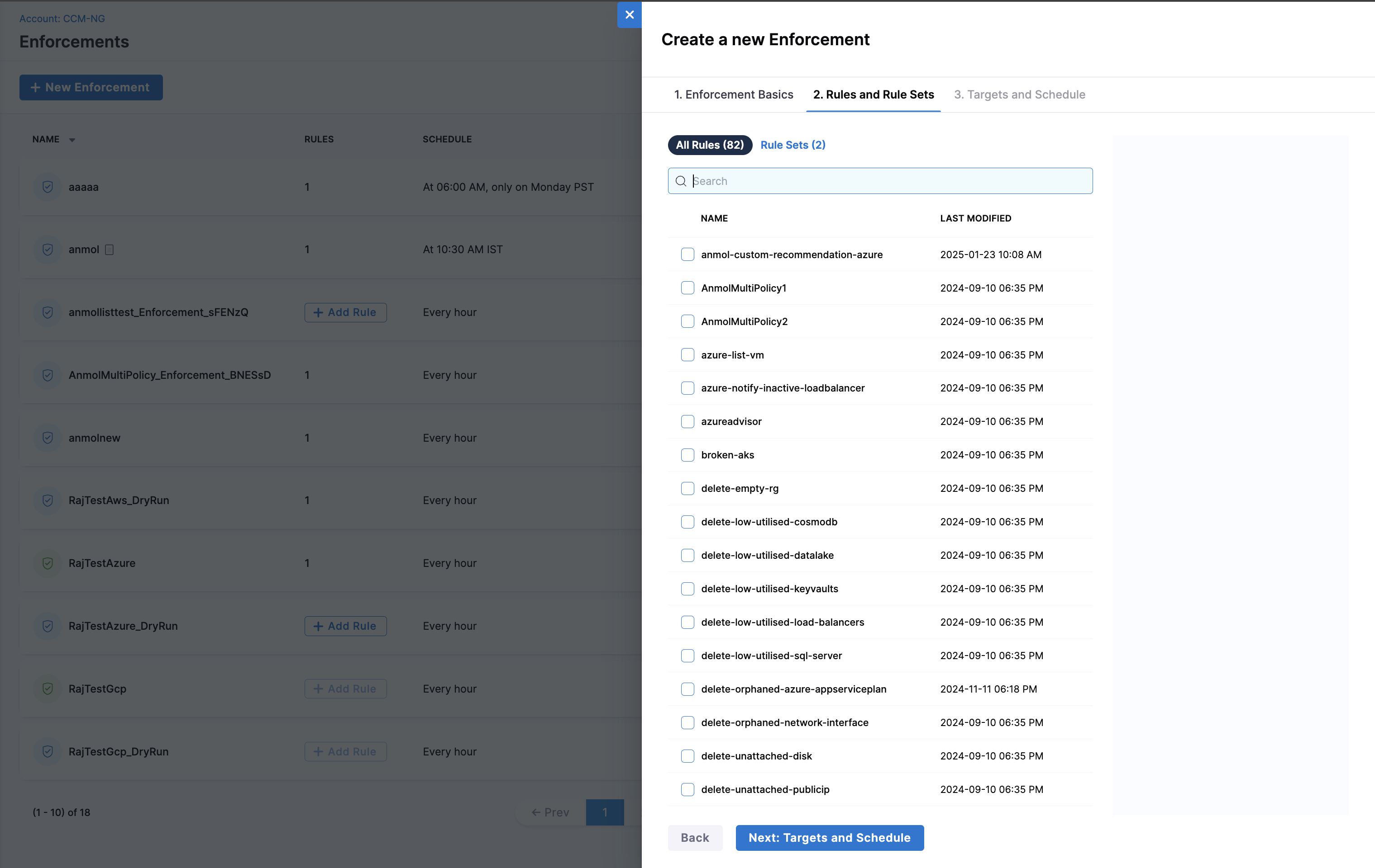 Enforcements enable you to enforce a certain set of Rules or Rule Sets (also known as governance guardrails) against a specific set of targets (accounts, projects, or subscriptions) to run periodically. Sometimes, we need rules to run periodically, such as every day, week, or month. However, running these rules manually every day or week at a specified time creates extra overhead and is a slow process prone to manual errors. To solve this, Enforcements allow users to set up a timely schedule and choose the day, time, and frequency for their rules or rule sets.
