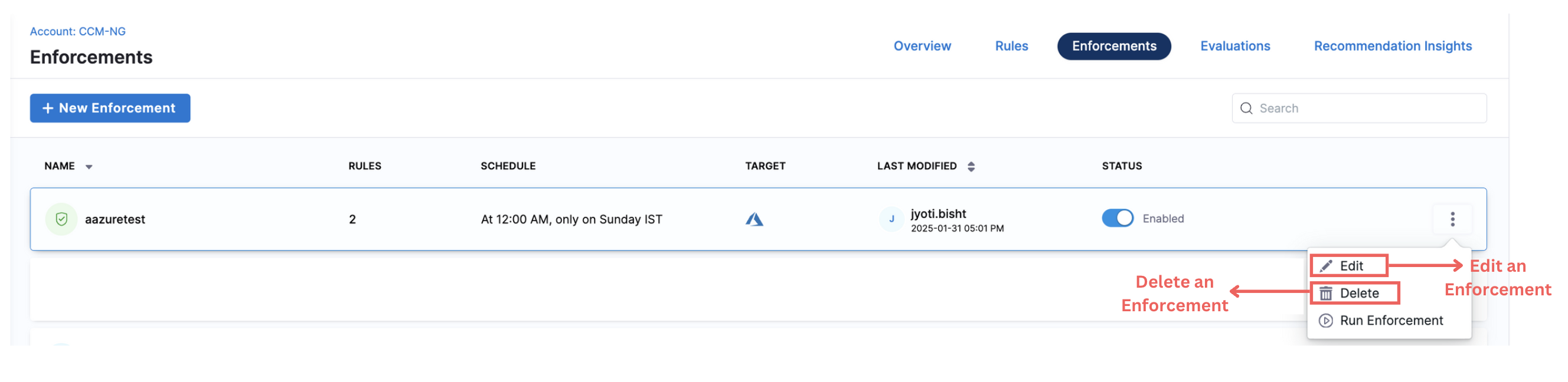 You can view any Enforcements on Rule Enforcements page. Click on the enforcement to view details such as the rules, target accounts, and regions included in the enforcement. For updating, you can use the "Edit" button from the vertical ellipsis menu (⋮) to update the enforcements as per your convenience.