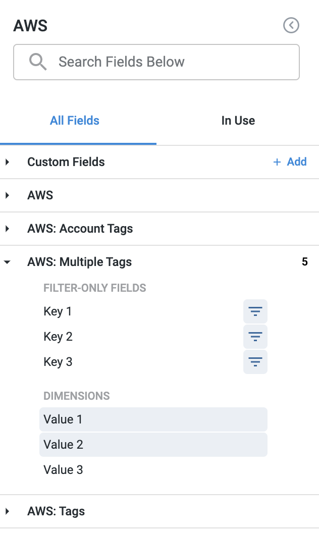 Multiple tags in AWS dashboards can be used to filter and visualize data based on unique Tags and their values. This can be used to drill down the data for specific key values. If you filter AWS: Multiple Tags - Key 1