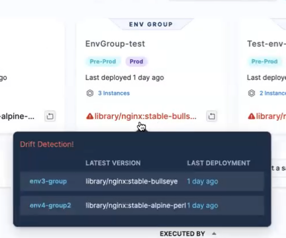 Drift detection: drift detection displays any differences between the deployments to environments in an environment group. For example, if the artifact you select was deployed to an environment group, but one of the group's environments deployed a different artifact, or due to some failure no artifacts were deployed to it, it is highlighted as drift:
