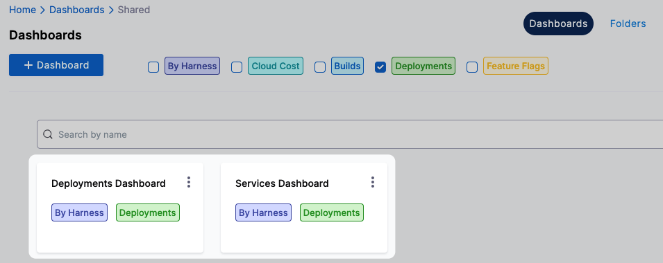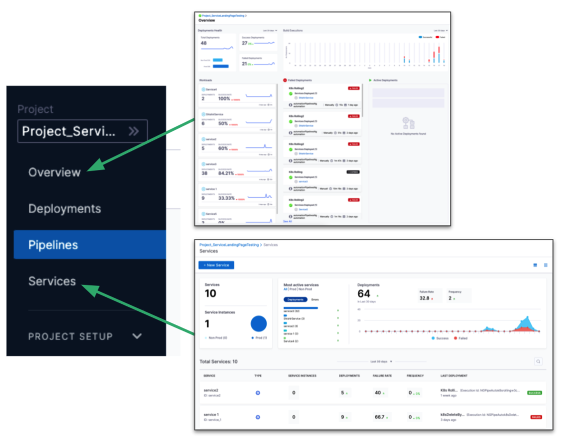Deployments and services can be measured within the CD module (Overview and Services in the Deployments module), and using the Harness Platform Dashboards (Dashboards). Platform Dashboards also let you create highly advanced custom dashboards.