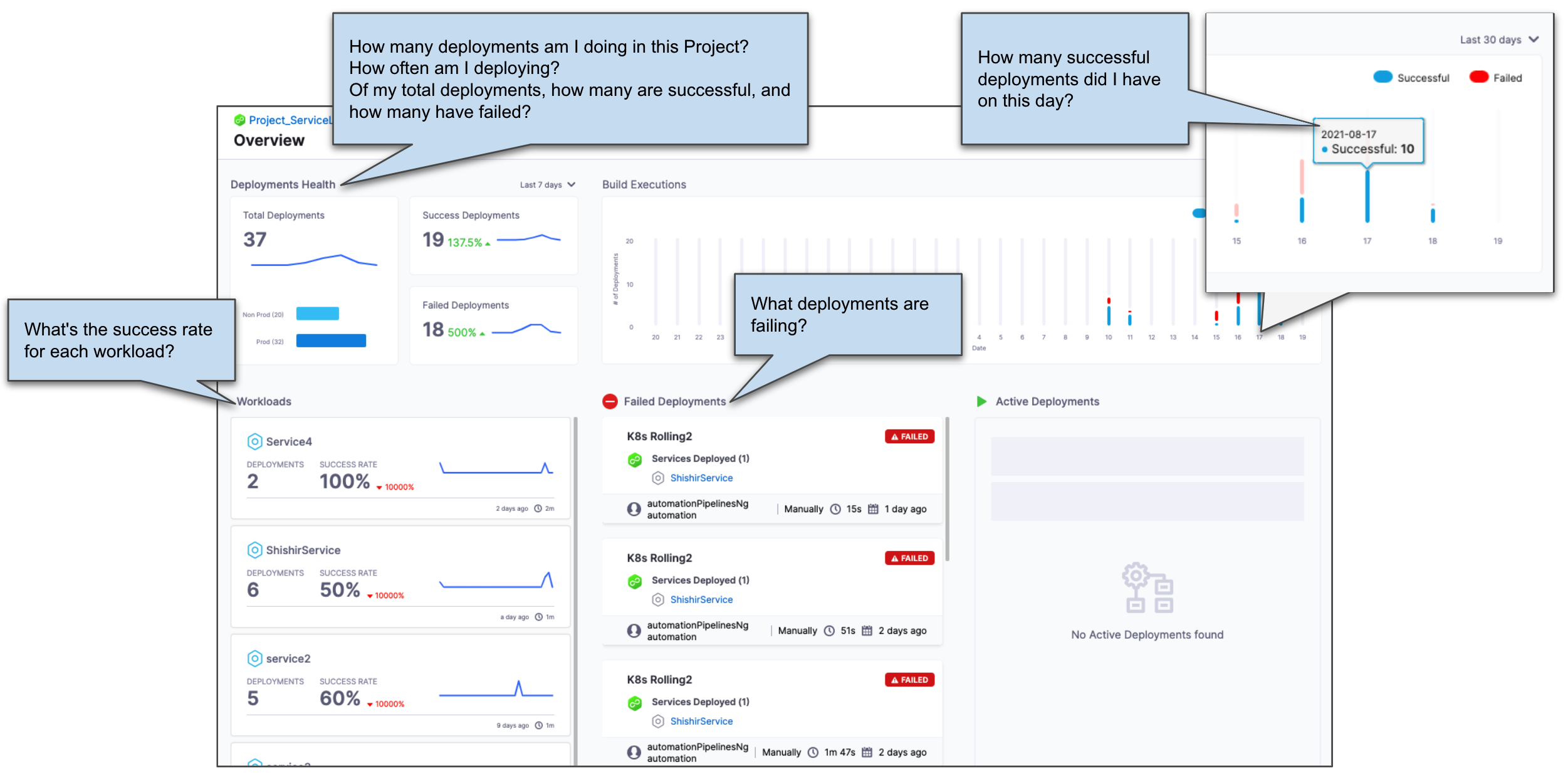 Harness CD includes an extensive set of dashboard components that provide visibility into the performance of your deployment pipelines. You can create custom dashboards to answer questions such as: