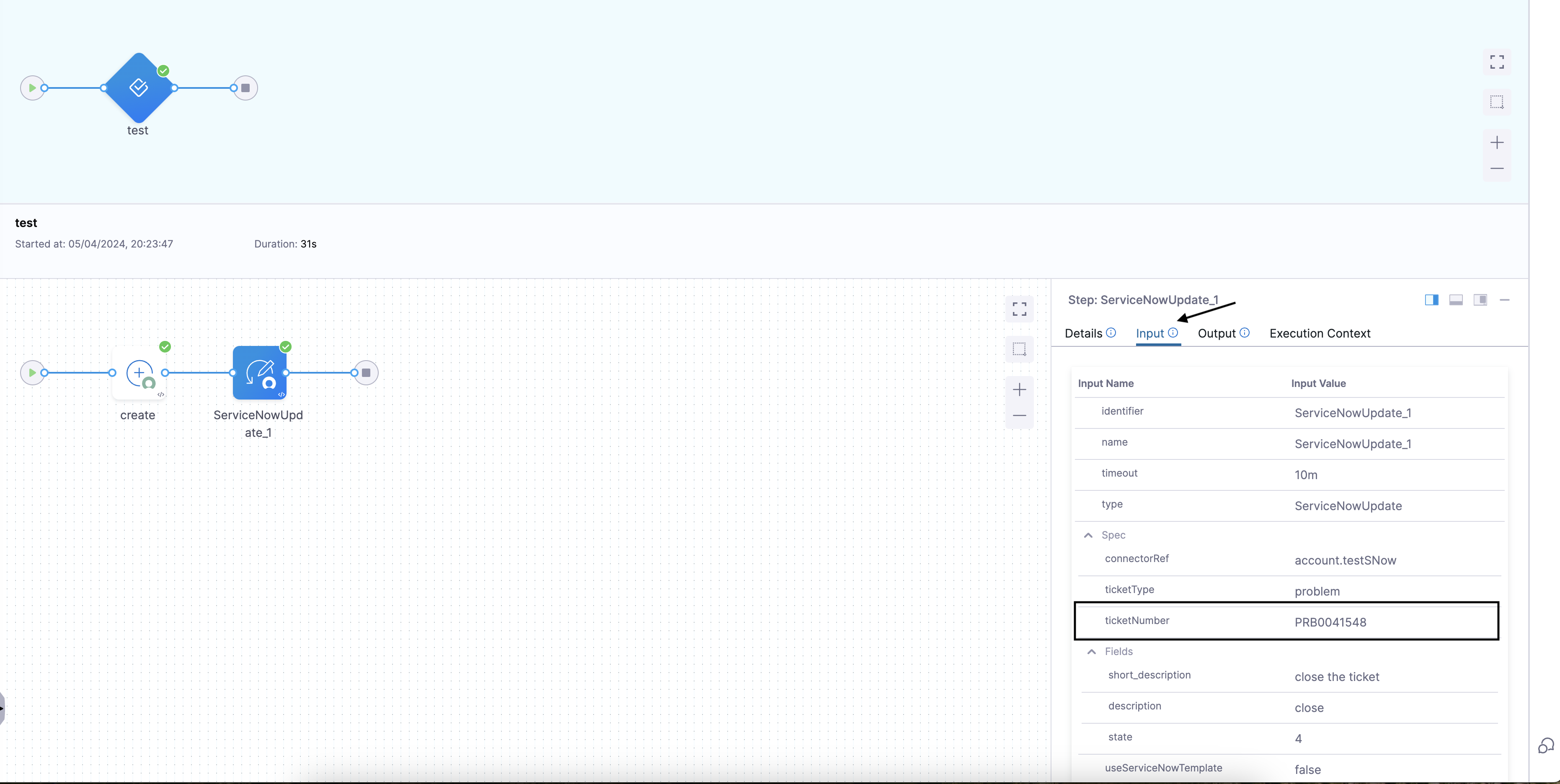 When you run the pipeline and check the input of the ServiceNowUpdate_1 step, you'll notice that the ticket number is retrieved from the expression <+execution.steps.create.ticket.ticketNumber>, as depicted in the below screenshot.
