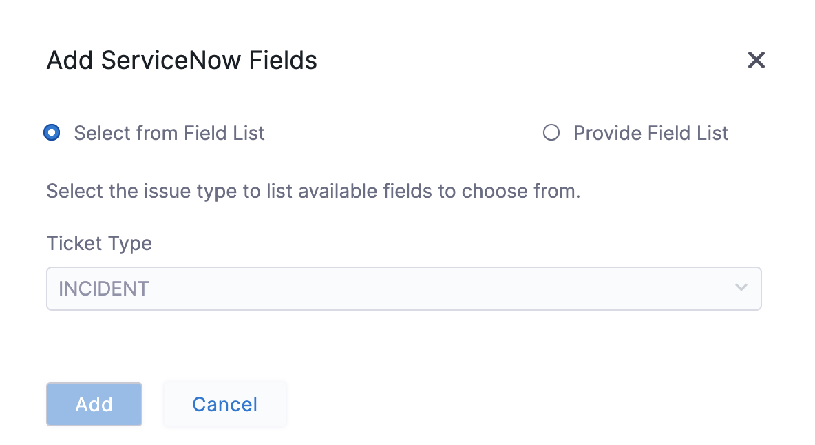 3. Select Fields. The Add ServiceNow Fields settings appear.