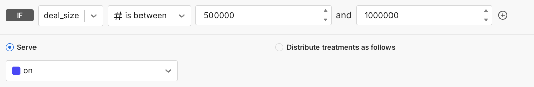Serve the on treatment for users with custom attribute deal_size between 500,000 and 10,000,000: