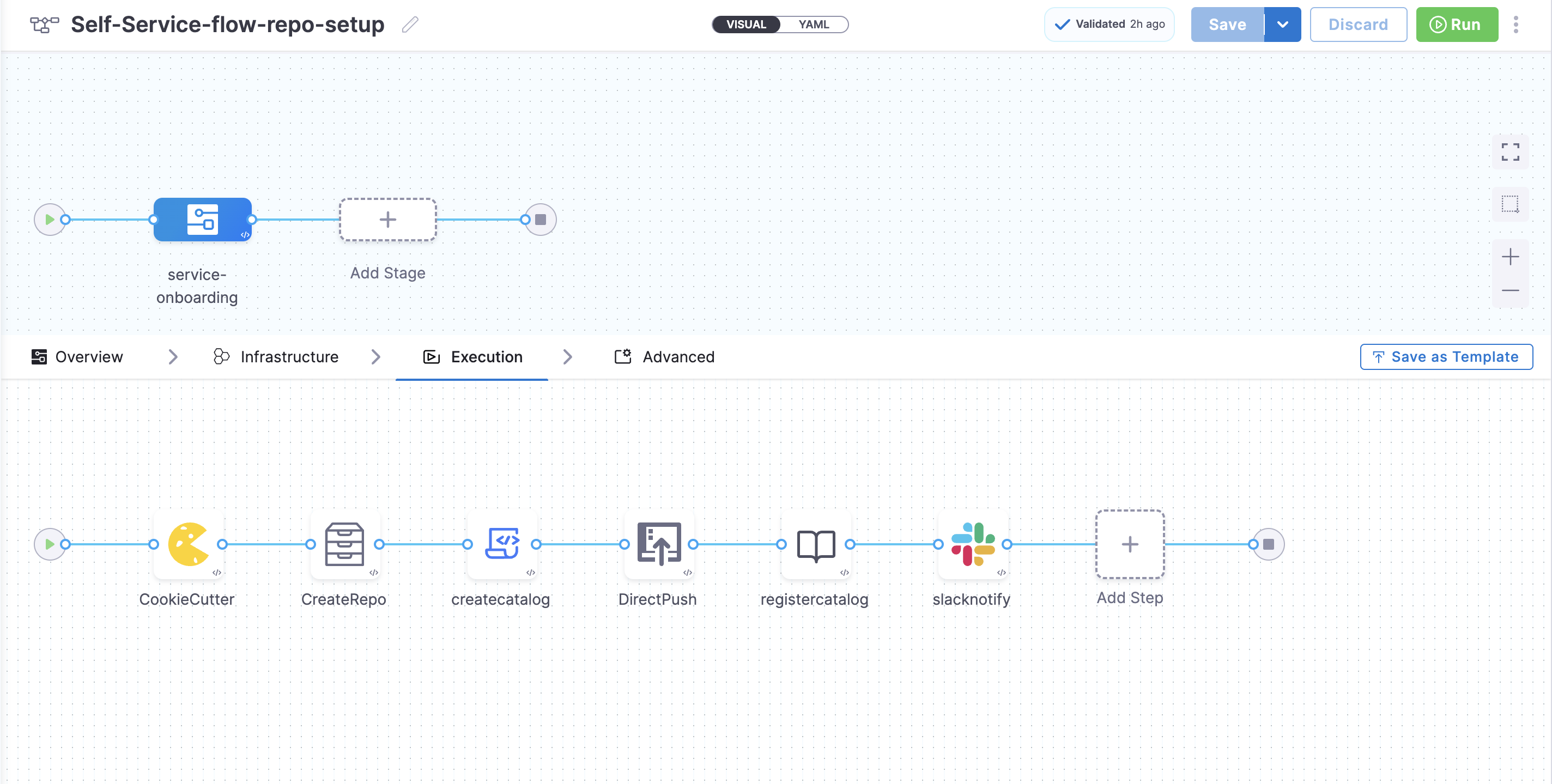 Harness IDP includes a native IDP Stage where all IDP-specific tasks required for pipeline execution are pre-configured as pipeline steps within the stage. This enables quick and efficient creation of self-service workflows.