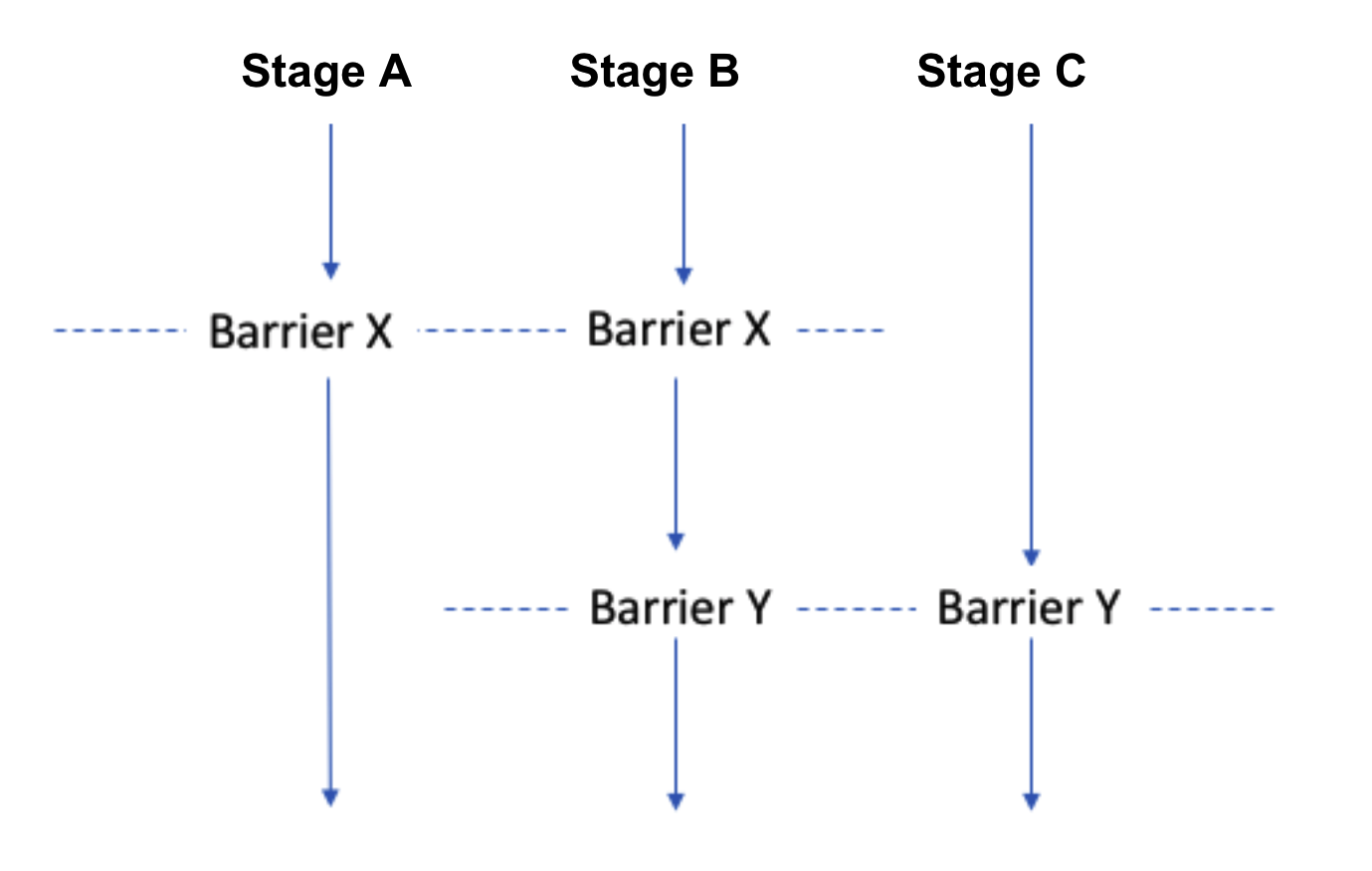 • All stages or step groups referencing the same barrier must reach the barrier point. Only then do they all proceed simultaneously past that point.