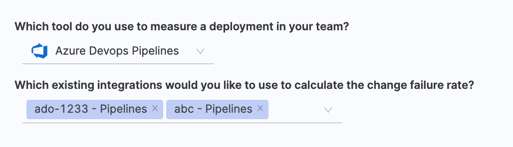 - Select the relevant Azure DevOps Pipelines integrations that you wish to use for calculating change failure rate.