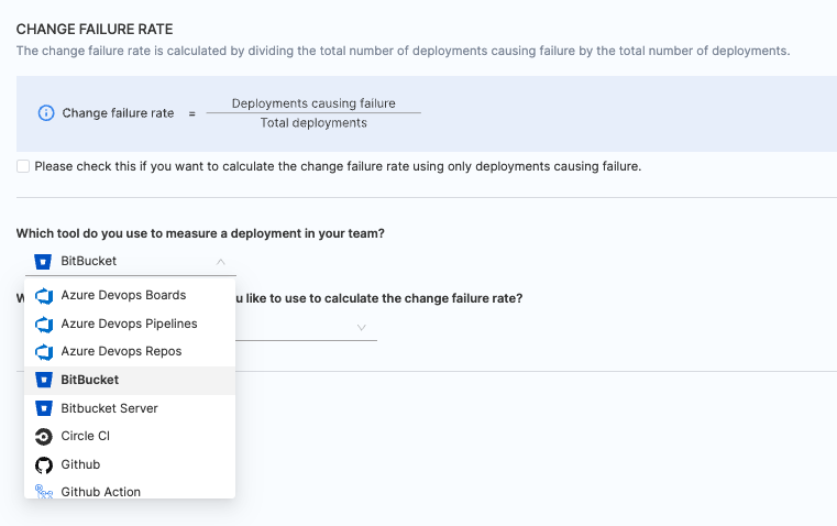 - Choose BitBucket / BitBucker Server as the tool that you use to measure change failure rate in your team.