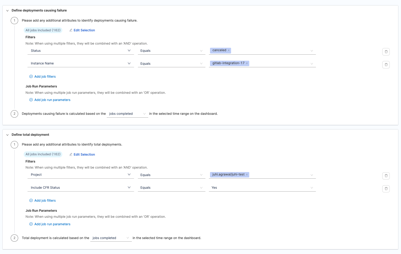 - Define additional attributes to identify deployments causing failure and total deployments. When using multiple filters, they will be combined with an 'AND' operation.