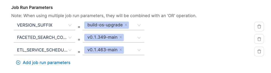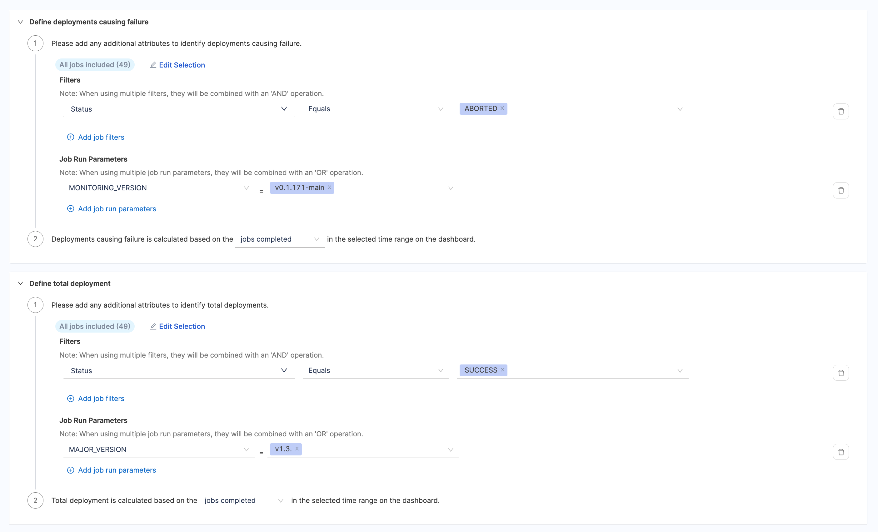 - Define job run parameters in key-value pairs. When using multiple job run parameters, they will be combined with an 'OR' operation. Similarly describe what defines a deployment causing failure based on the jobs completed or jobs started events in the selected time range.