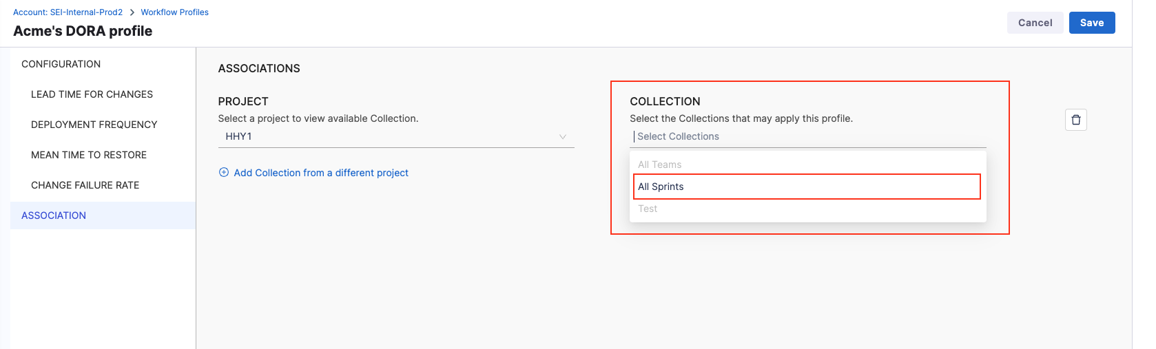 Note that for calculating DORA metrics, each profile can be associated with only one Collection in a one-to-one mapping