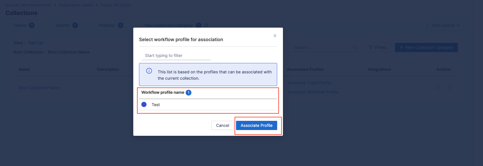 - To associate a DORA profile with the existing Collections, click on the Associate Workflow Profile option under the Associated Profiles column.